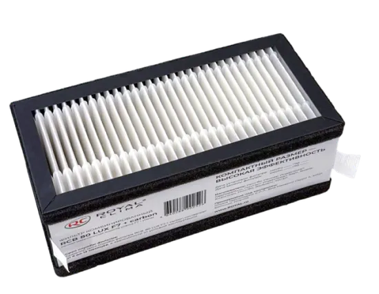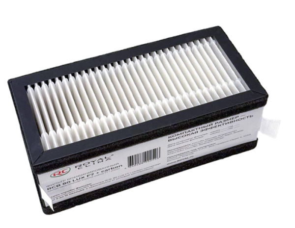 Фильтр RCB 80 LUX F7+carbon – в одном корпусе соединен фильтр класса F7 и угольный фильтр. Фильтр тонкой очистки удерживает частицы меньше 0,4 мкм со средней эффективностью до 50%. Фильтр F7 способен задержать такие частицы как: частицы краски, ржавчины, пыль среднего и мелкого размера, частицы стекла, а также пух и пыльцу некоторых растений.