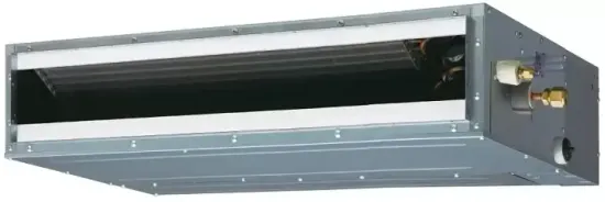 Внутренний блок обладает рекордно малой высотой (всего 198 мм), что позволяет устанавливать данную модель в ограниченном пространстве. При запотолочной установке можно осуществлять забор воздуха как с нижней, так и с тыльной стороны внутреннего блока. Непревзойденный уровень статического давления вентилятора 90 Па гарантирует подачу теплого воздуха на уровне пола при работе на обогрев помещения. Отдельно следует отметить низкий уровень шума при работе этой модели кондиционера.