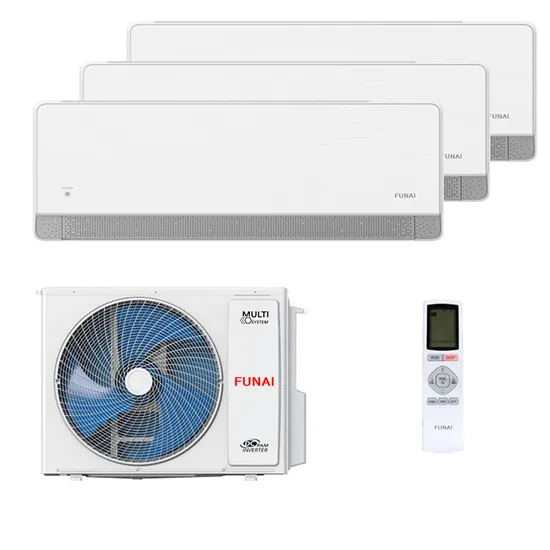 Инверторная мульти сплит система Funai RAM-I-KMS25HP.W01/S x 3 / RAM-I-3OK60HP.01/U на 3 комнаты из серии Kagami Shiro – это современный вариант климата сразу для нескольких помещений. Три блока подключаются в 1 наружному блоку, управляются индивидуально в пределах установленного режима или на охлаждение или на обогрев.