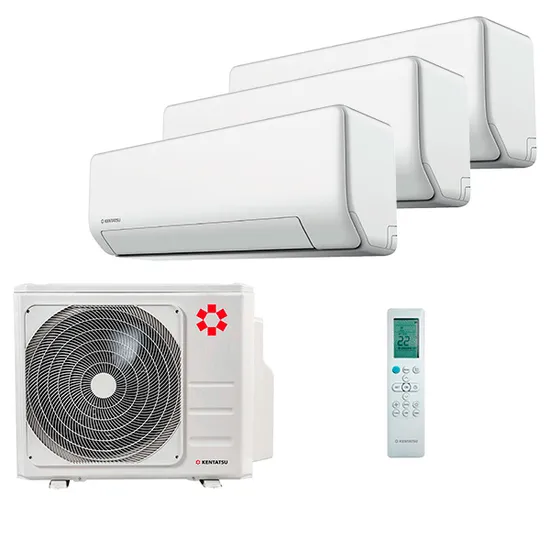 Если необходимо установить кондиционер в 3 комнатах, но при этом нет возможности монтировать несколько наружных блоков на фасаде здания, можно использовать инверторную мульти сплит-систему Kentatsu KSGPA26HZRN1 x 3 / K3MRB60HZRN1. Она предполагает подключение трех внутренних блоков, которые можно установить в разных комнатах. Каждый из кондиционеров имеет свой собственный пульт управления, поэтому есть возможность регулировки температуры исходя из индивидуальных потребностей пользователя.