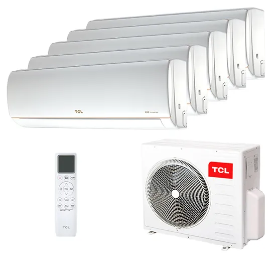 Организовать кондиционирование сразу в пяти комнатах возможно благодаря мульти сплит системе TCL TACM-09HRID/E1 x 5 / TACM5O-42HID. Данный комплект походит для небольшого помещения с суммарной площадью до 125 кв.м. Настенные блоки управляются с помощью инфракрасного пульта, при чём у каждого блока есть свой пульт.
