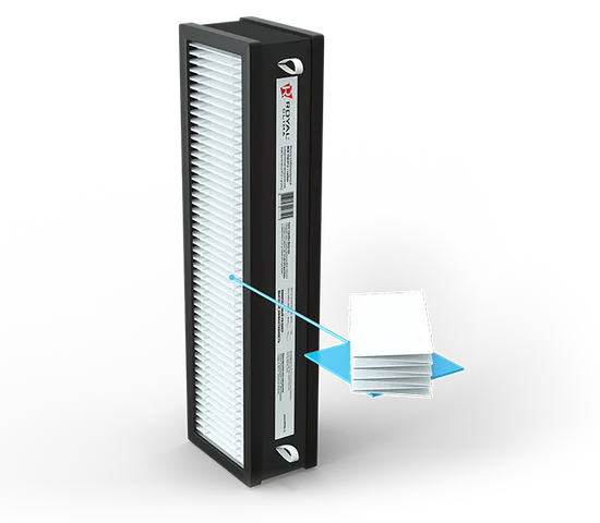 Сменная фильтрующая вставка: HEPA-фильтр медицинского класса и угольный фильтр RCB 150 H12 + carbon. Средний срок службы фильтра составляет от 12 до 24 месяцев, в зависимости от условий эксплуатации.